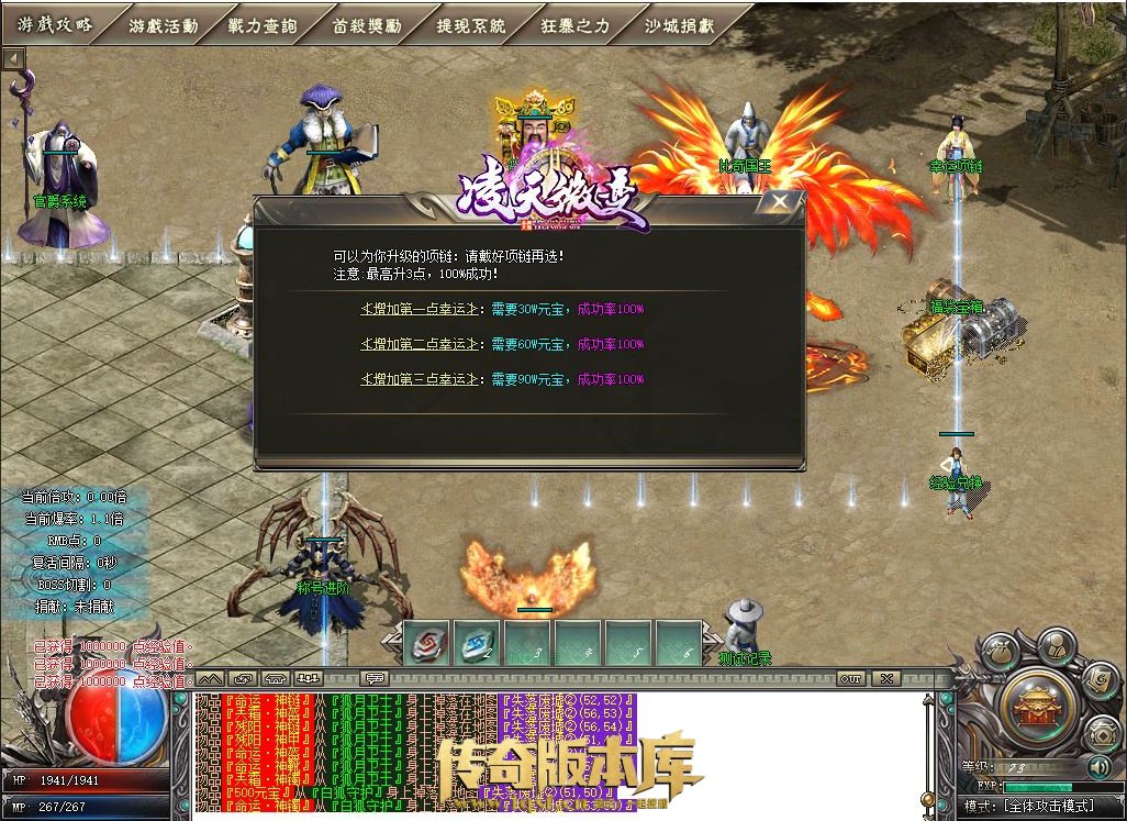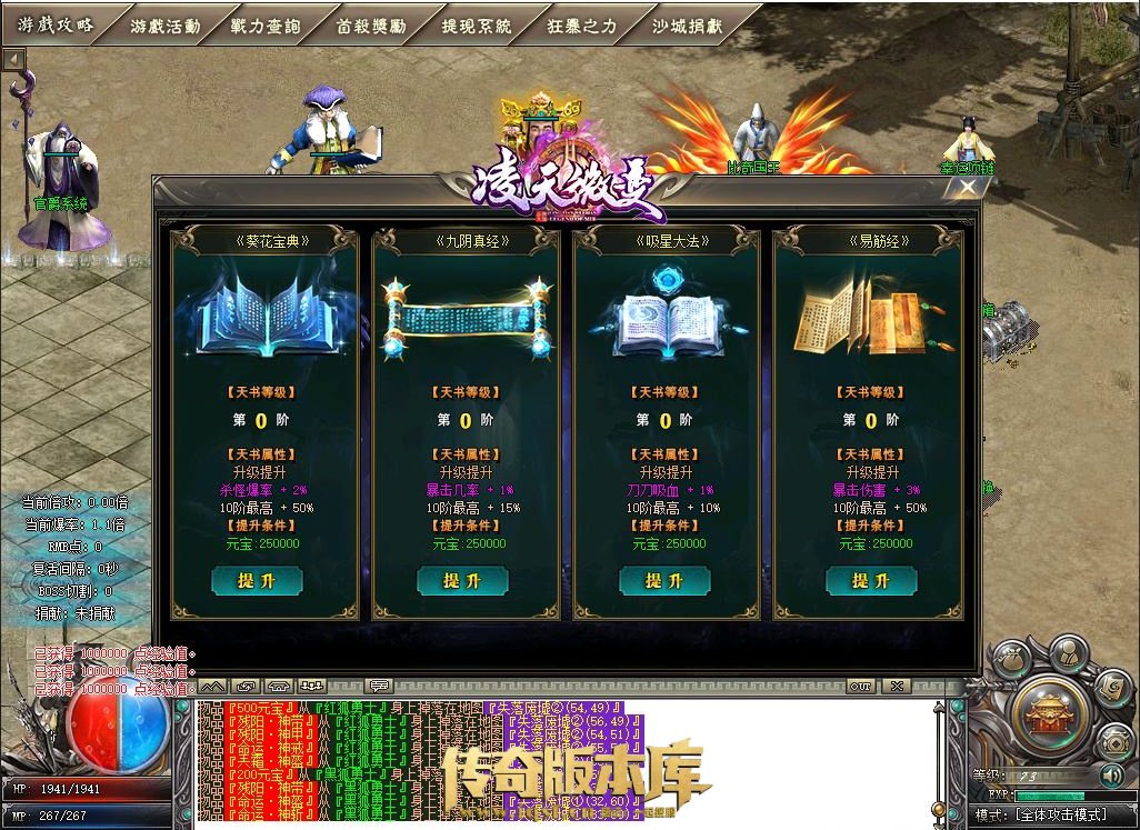 1:不管是打金玩家还是老板土豪 建议有多余元宝一定要先升级天书的爆率加成(哪怕只提升几次.爆率加成的感觉明显不一样(升满更爽).)