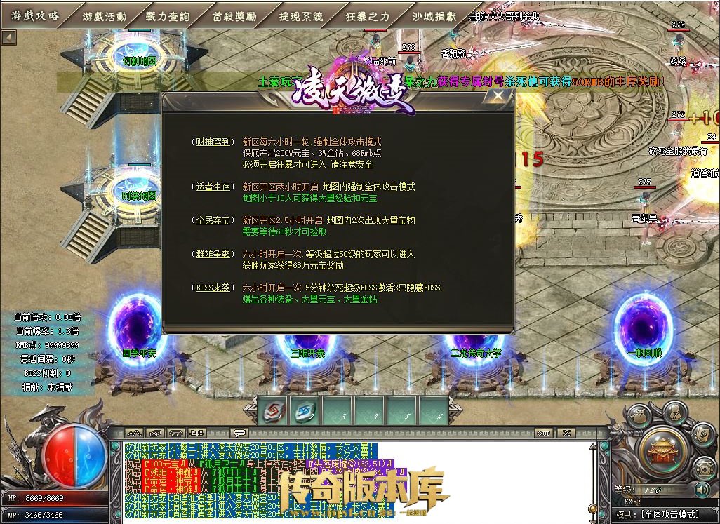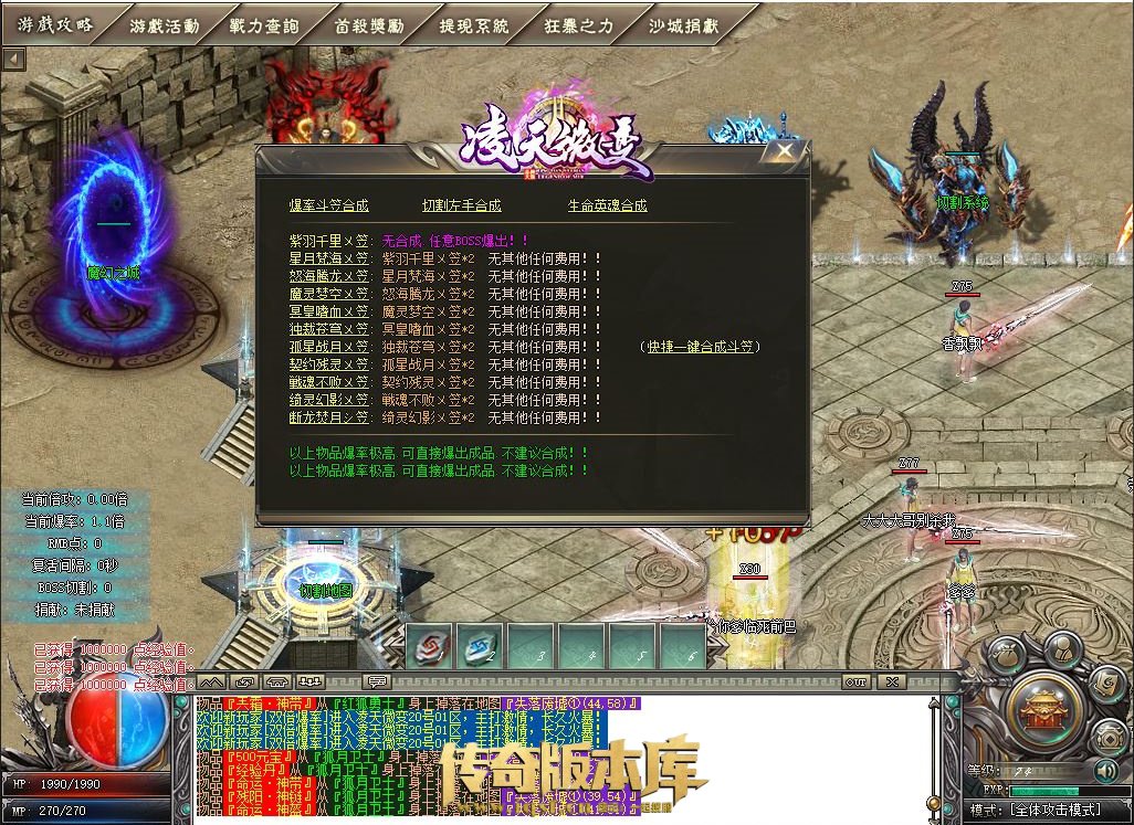 3: 天材宝箱在转生地图所有BOSS的爆率为1/3 切割地图和一品官爵地图爆率超高(官爵地图从切割地图中间NPC进)